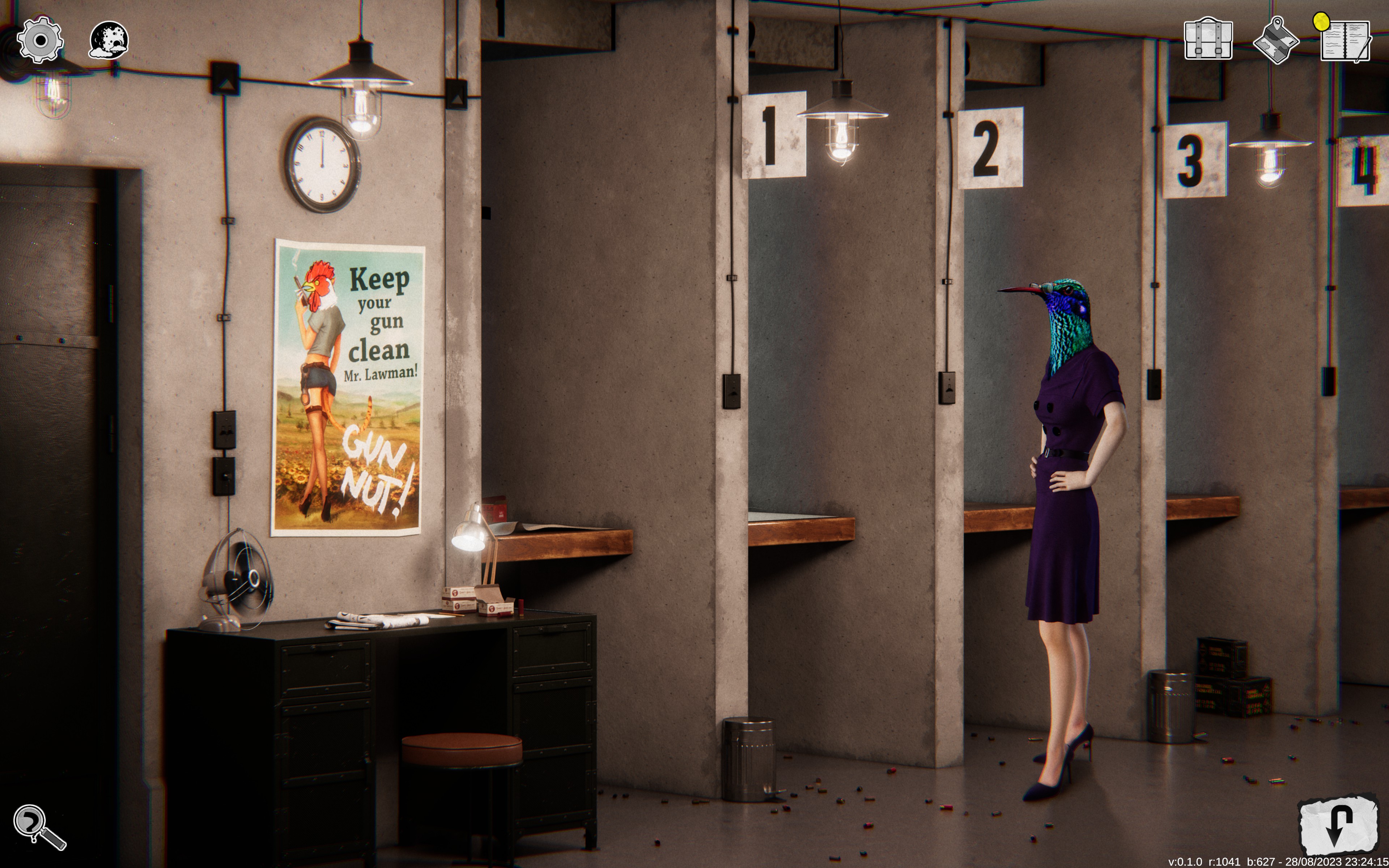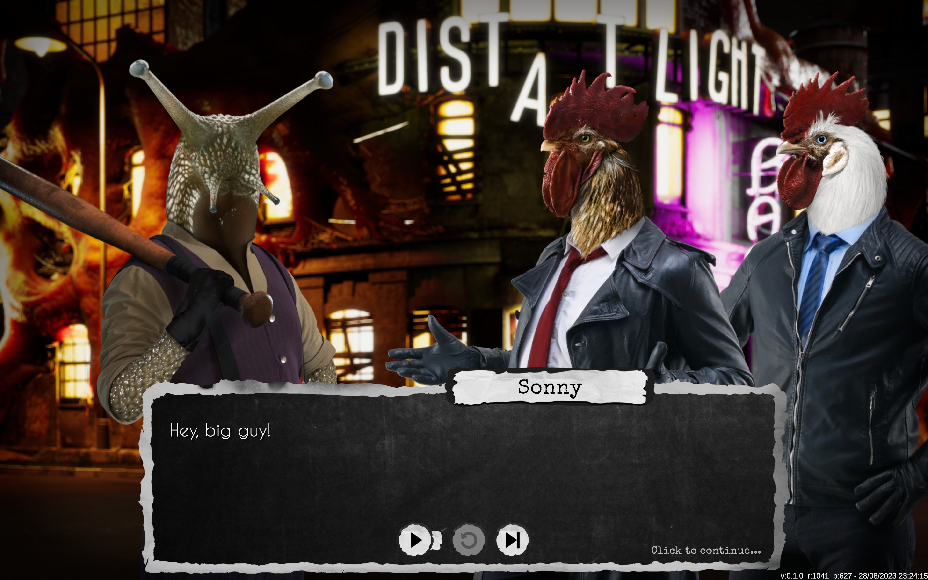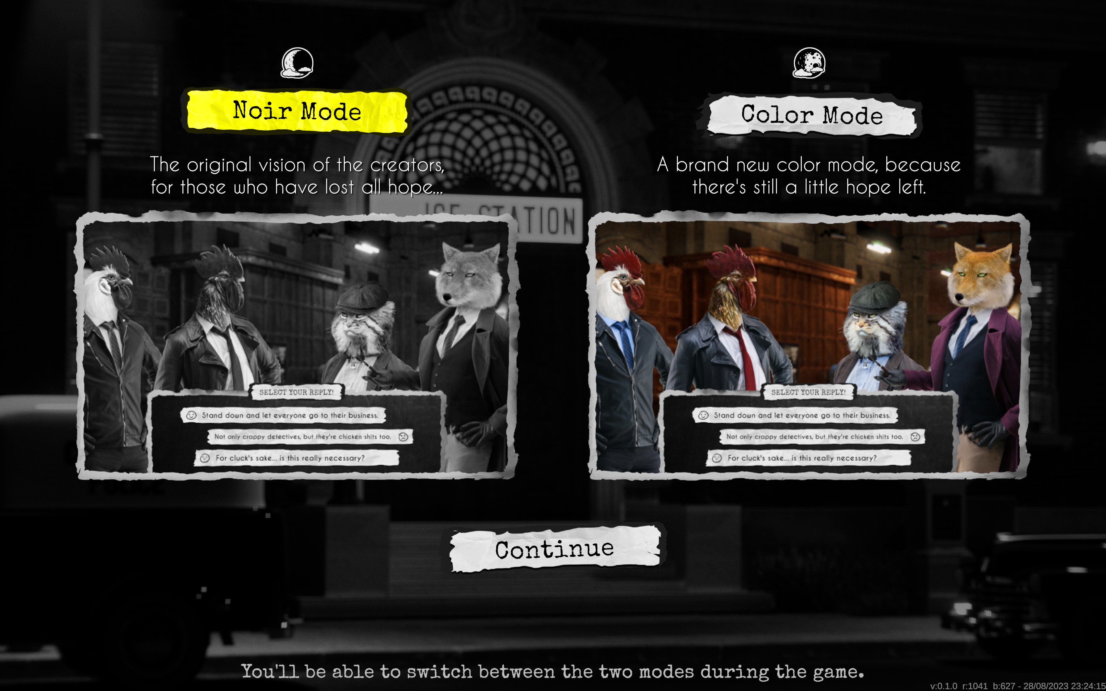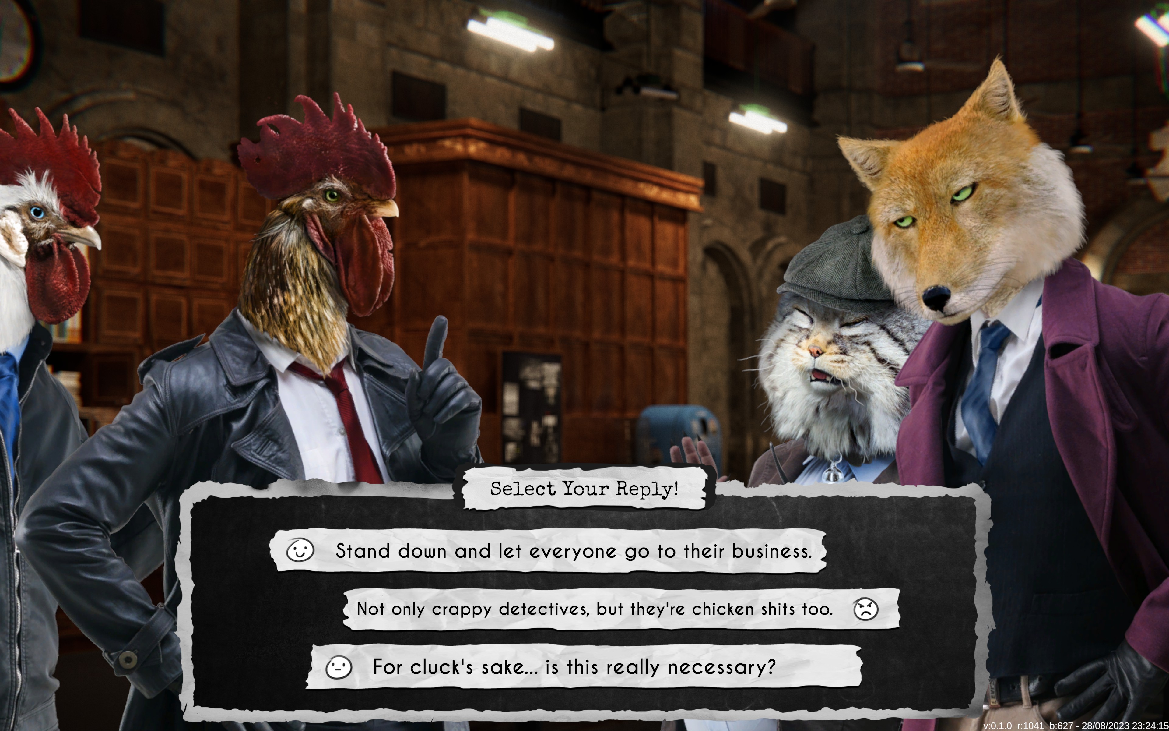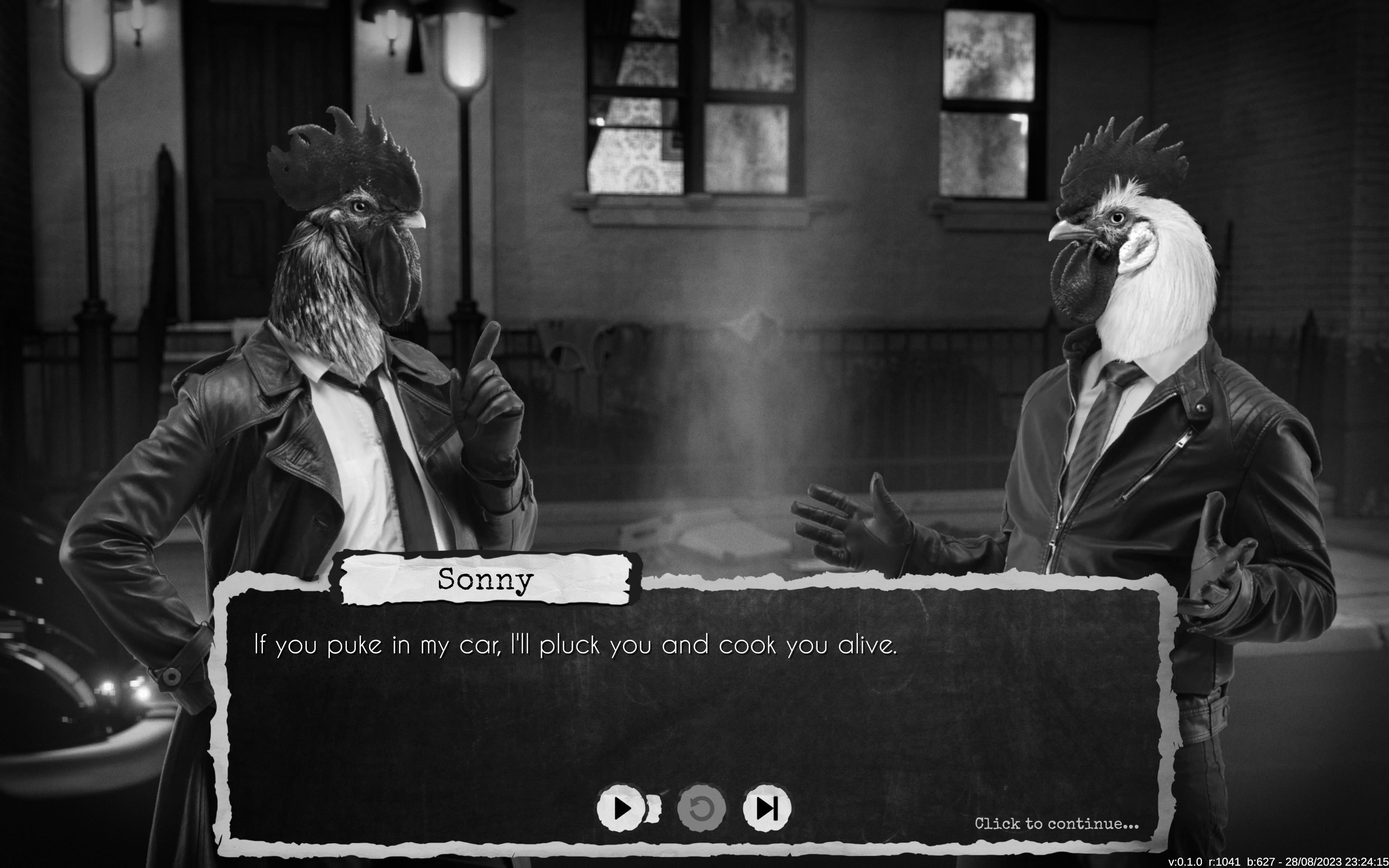 Autre point important : il s’agit ici de la version PC. Pour autant, et bien que ma config (fournie par Razer) vienne tout droit du futur, vous pouvez pousser un grand « Ouf ! » de soulagement, tant ce Chicken Police deuxième du nom pourrait aisément tourner sur des machines à écrire des années 1940 (ou presque). D’ailleurs, et ce sera la dernière précision de la journée, sachez qu’aucune date de sortie ne m’a été confirmée. Tout ce que l’on sait, c’est que le jeu arrive « courant 2024 ».
