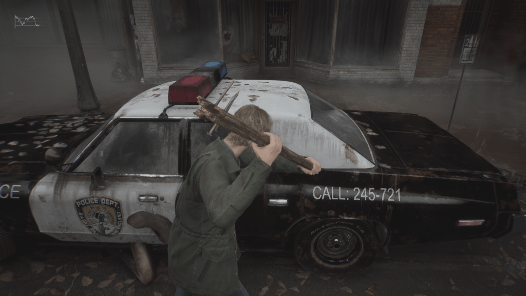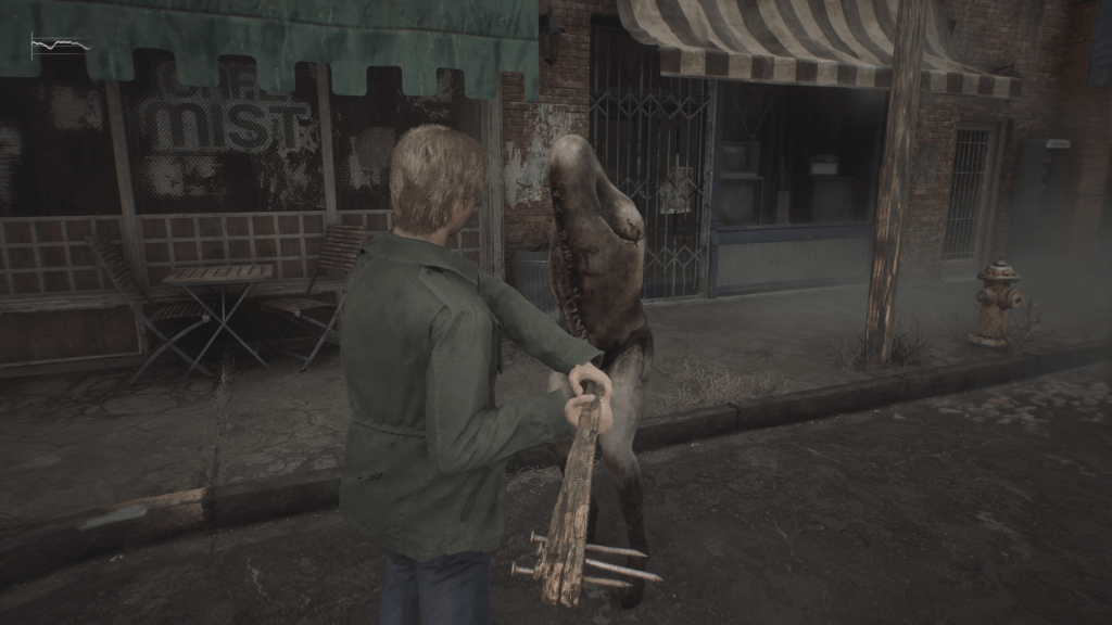 Rassemblant tout son courage (et son manteau le plus moche), James va donc débarquer comme un boulet de canon (mais sans le canon) en plein coeur de la cité maudite qu’on lui avait déjà fait visiter sur PS2 il y a 23 ans. Premier constat : en mode Qualité (4K / 30fps) le jeu est graphiquement décevant (mes screenshots maison parlent d’eux-mêmes). Étonnant pour un projet tournant sous Unreal Engine 5. Second constat : le mode Performance, capé lui à 60 images / seconde, est bien plus agréable manette en mains… mais le jeu devient alors encore plus moche et multiplie même les bugs techniques. Ombres qui sautent, micro-chutes de framerate… Le constat est bien loin d’être élogieux (et ce peu importe le mode choisi, attention !).