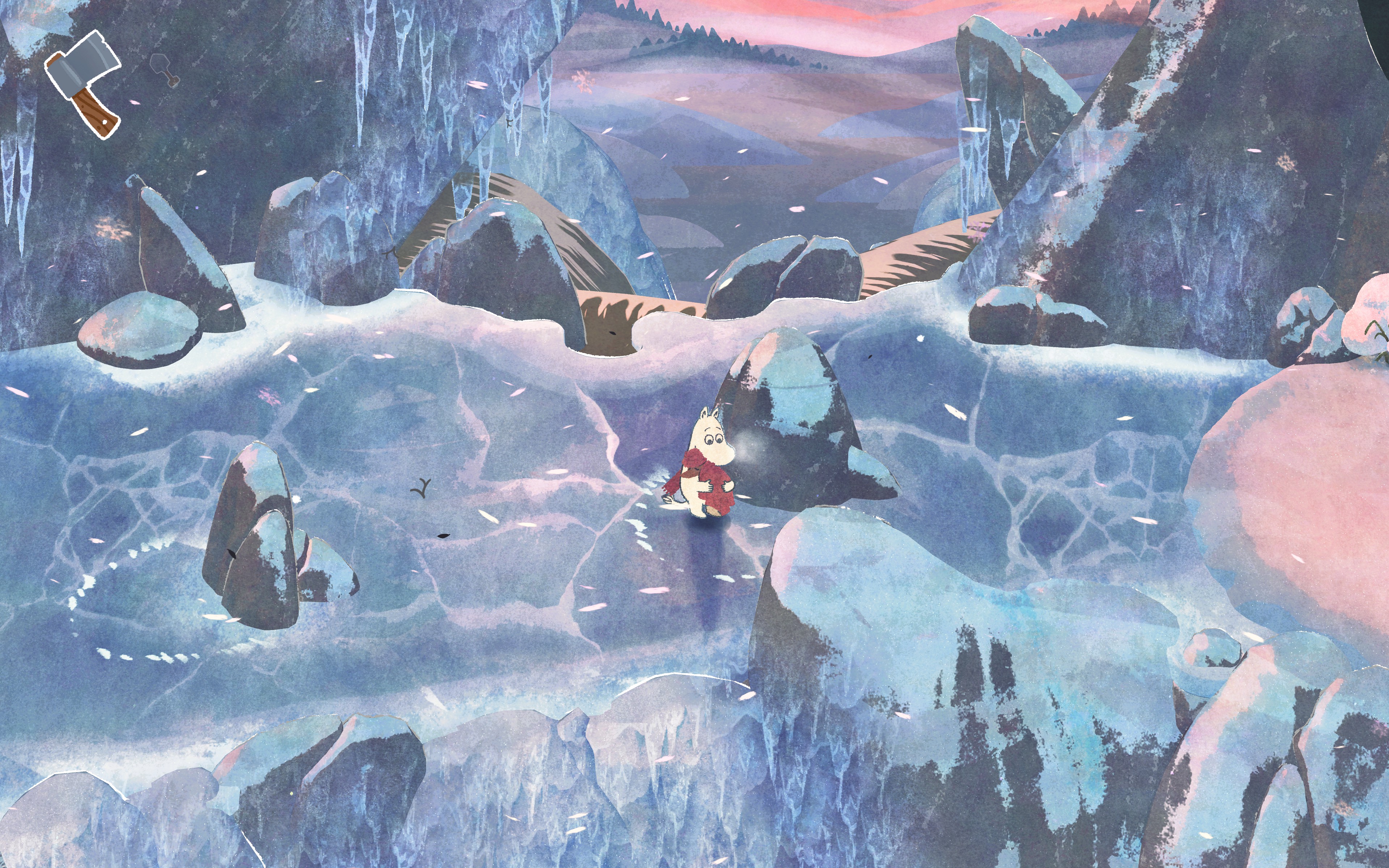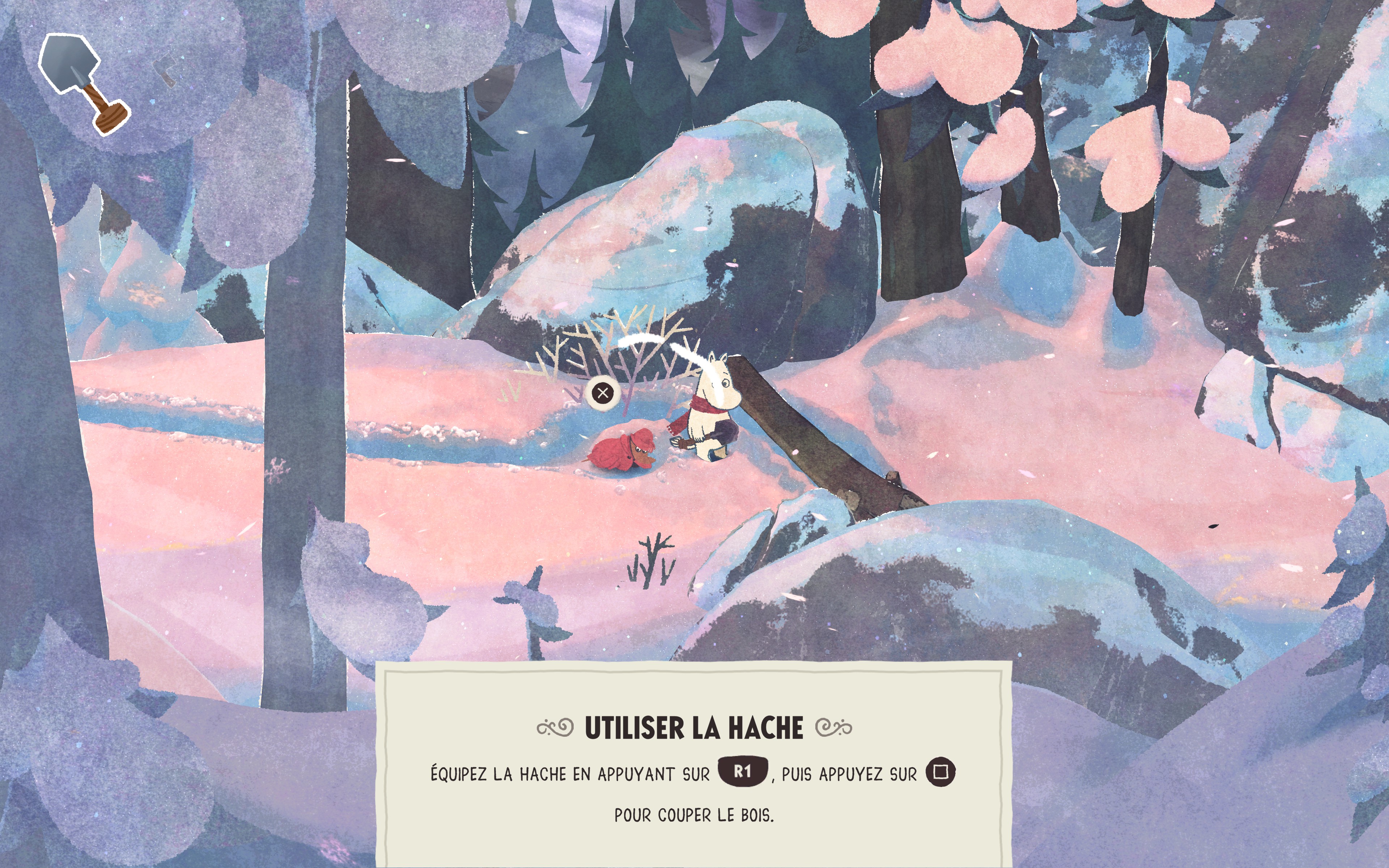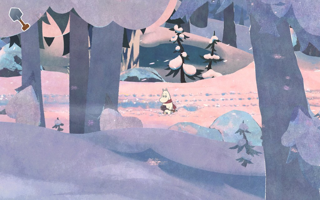 Ainsi, durant cette démo, je devais sauver le fameux Sorry-Oo (Ouin Von Miserabilis en VF). Pour ce faire, le jeu nous demande de le protéger du froid, en évitant soigneusement les rafales de vent environnantes. On alterne donc entre les phases où l’on doit se réfugier derrière les rochers (à la The Midnight Walk) et celles où l’on a pour mission de déblayer le passage. D’abord en coupant les rondins de bois (via la hache), puis en retirant la neige qui nous fait face (via la pelle). Rien de très compliqué, entendons-nous bien, mais non seulement le personnage répond au doigt et à l’oeil, et surtout, comme en 2024 cette nouvelle aventure se veut aussi accessible que possible. En effet, et pour conclure cette preview, laissez-moi préciser que le jeu d’Are Sundnes et son équipe n’a aucunement pour ambition de venir titiller les cadors de la catégorie « gameplay exigeant ». Le but ici est de raconter une histoire poétique, teintée d’humour et de mélancolie, le tout à travers les (més)aventures de Moomin, le troll le plus maladroit et/ou malchanceux qui soit.