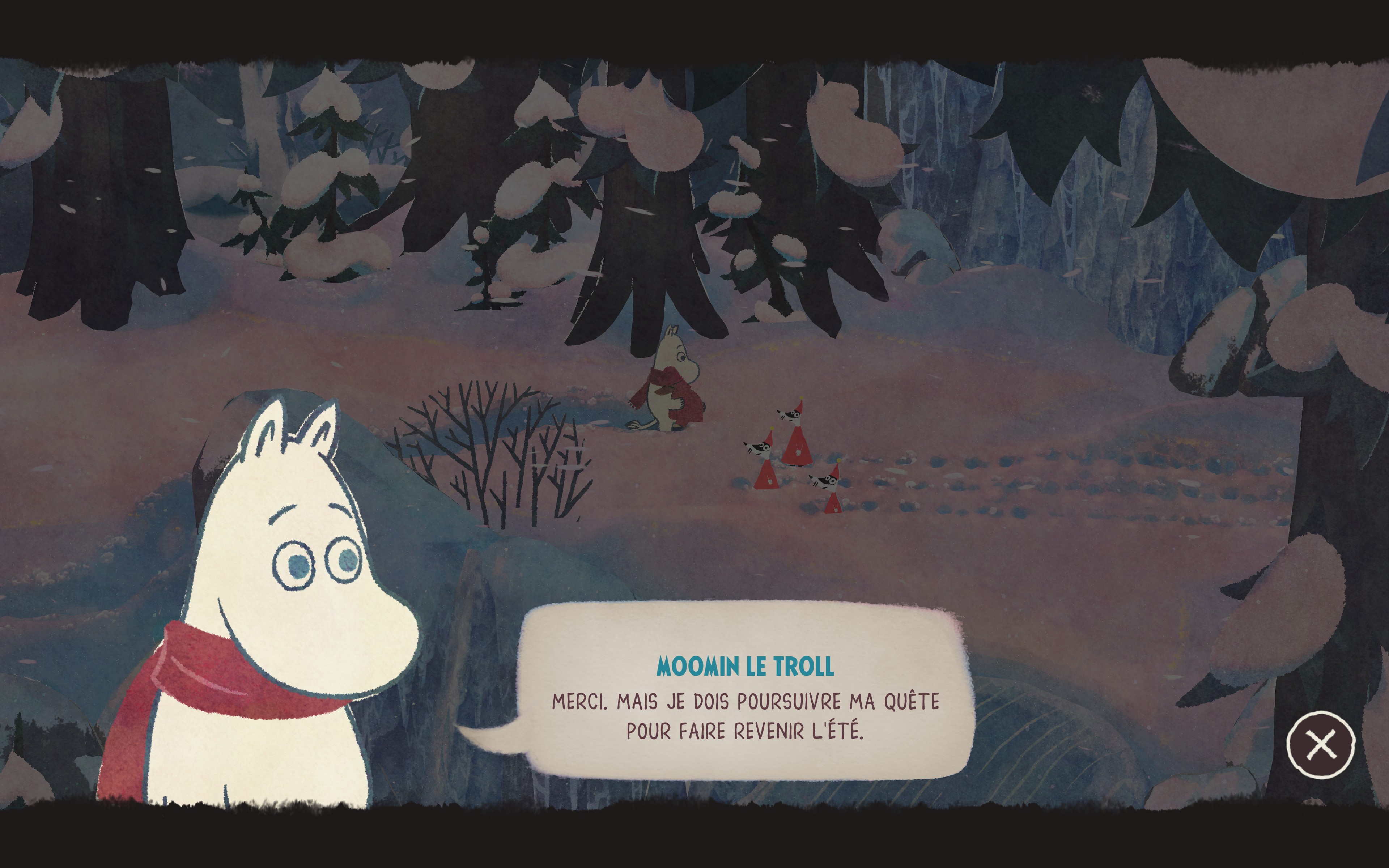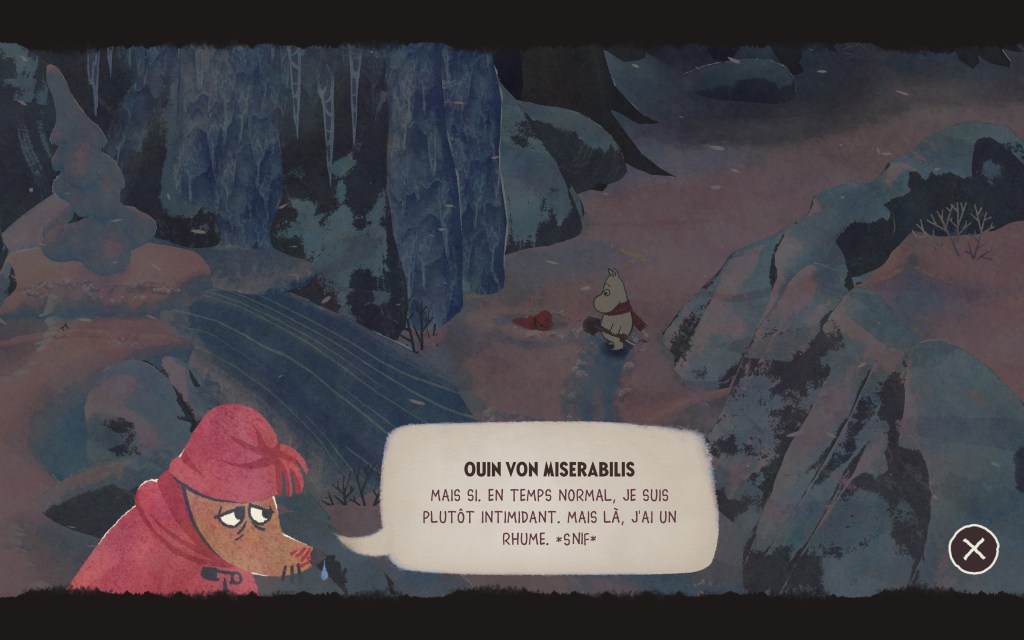 En tant que grand fan moi-même de l’oeuvre de Jansson, il est évident que mes attentes concernant ce nouveau jeu se trouvent assez haut sur mon Moominomètre. Par conséquent, je suis heureux de vous dire à quel point cette courte démo (30 minutes environ) a fait grimper ma hype encore davantage. En termes de présentation tout d’abord, cette omelette norvégienne s’annonce sous les meilleurs auspices. En effet, l’esthétique « crayonnée » du premier jeu fait bien entendu son retour, mais se voit ici sublimée par des jeux de lumière et de couleurs vraiment superbes. Côté sonore nos tympans ne sont pour autant pas en reste, et le blizzard ambiant n’arrive pas le moins du monde à nous empêcher de profiter des mélodies oniriques jouées au piano. Et si, tout comme en 2024, le jeu ne propose aucun doublage (des onomatopées se font entendre lorsque les personnages interviennent), il est toutefois rassurant de constater que les textes (et les noms) sont cette fois encore traduits en français.