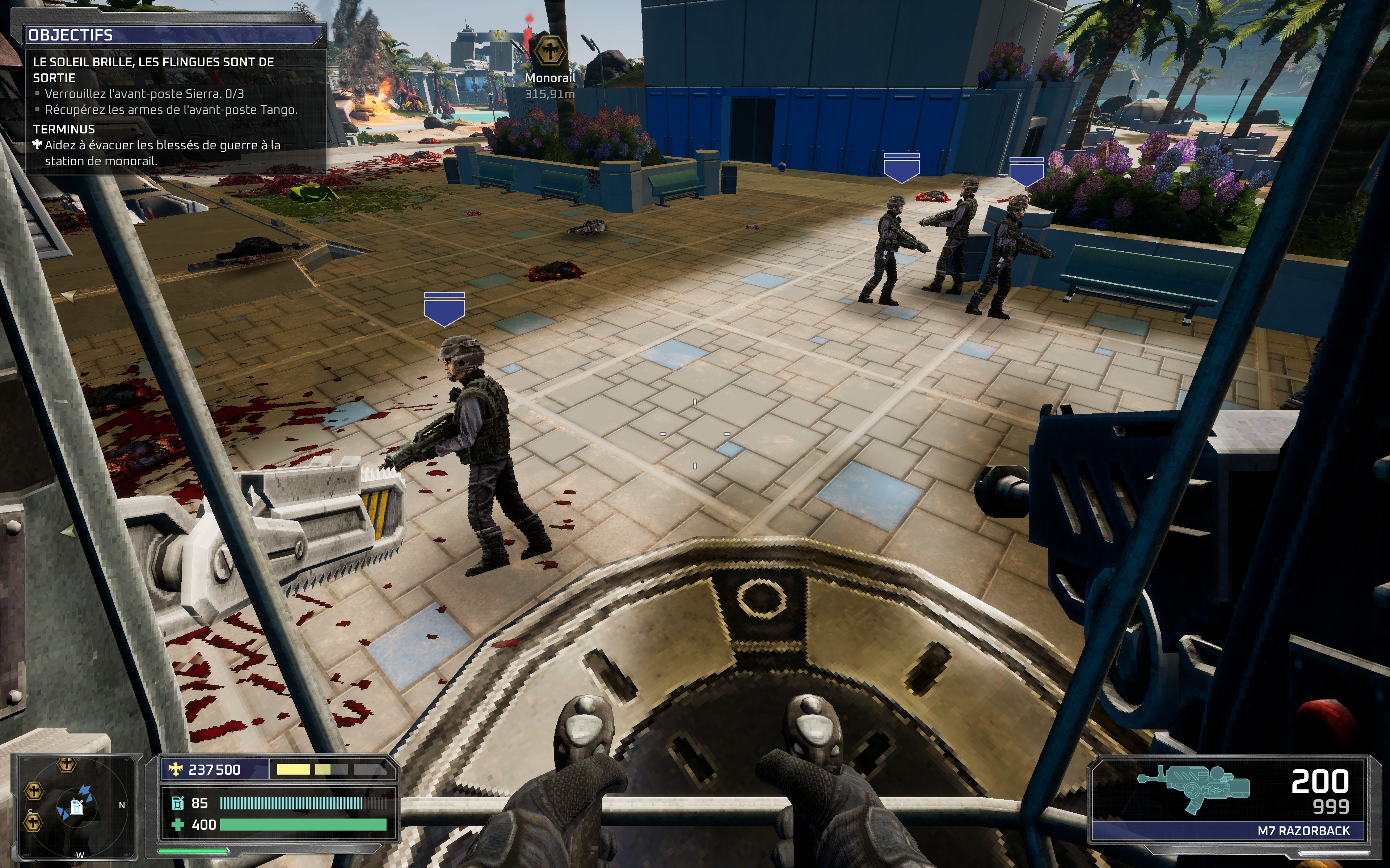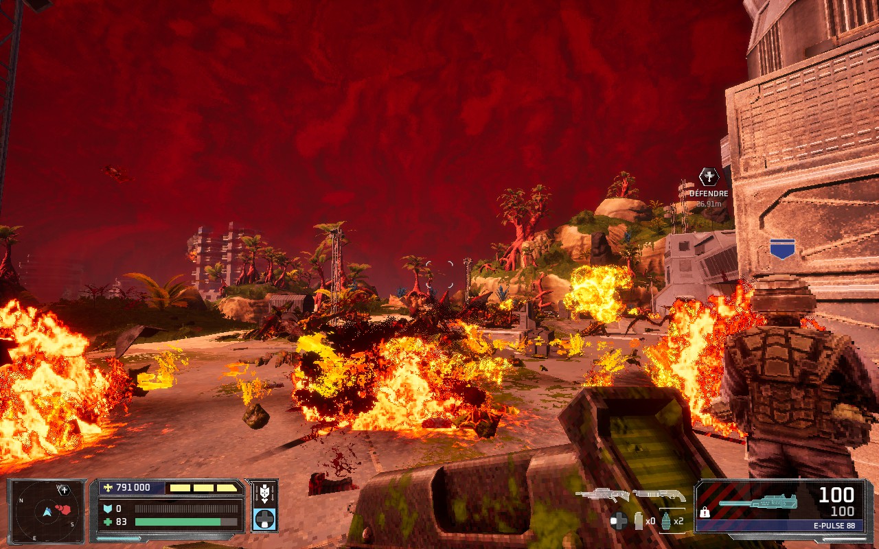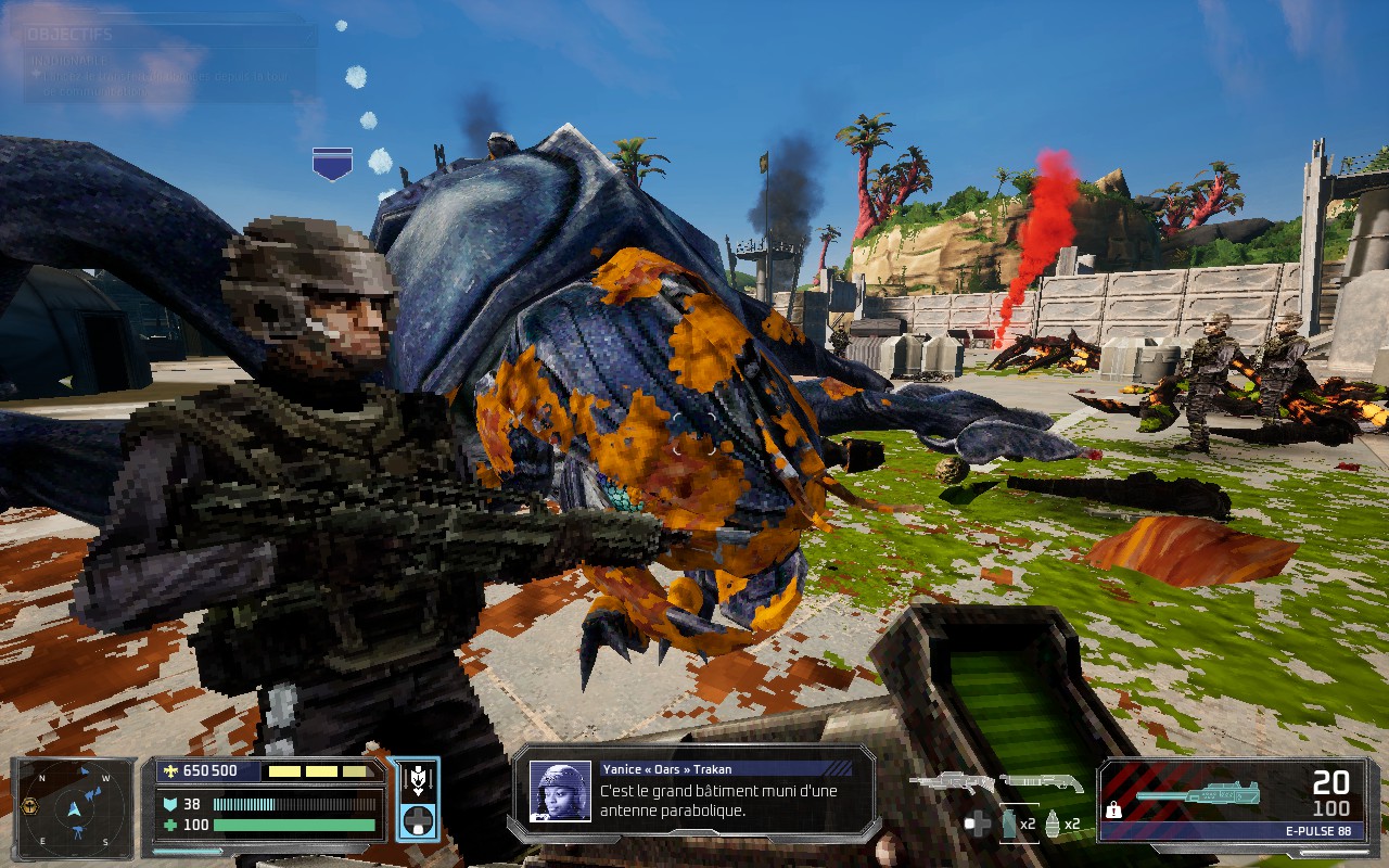 Mention spéciale pour les pétoires à notre disposition (il y en aura une trentaine au total dans le jeu complet). Fusil à pompe, sniper, rayon laser… Tout est mis en oeuvre pour nous donner les moyens de défoncer de l’insecte géant au petit-déjeuner. Et si cela s’avère insuffisant à votre goût, Auroch Digital a pensé à tout. Vous êtes en effet libre de vous servir de tourelles, de grenades, de mitrailleuses lourdes, et même de mechas armés jusqu’aux écrous. Un pur plaisir ! Pour ma part j’ai subi quelques fous rires durant cette preview, et notamment grâce / à cause du Friendly Fire (Tir Allié, en français). Les corps de nos collègues explosent dans des gerbes de sang tout de pixels vêtues, les cris de douleur rappellent nos meilleurs souvenirs de l’ère 128-bits, et les dialogues in-game sont dignes des films de guerre les plus décomplexés (« Je sens plus mes jambes… », « Je suis de votre côté ! », « Aïe, je meurs ! »…).